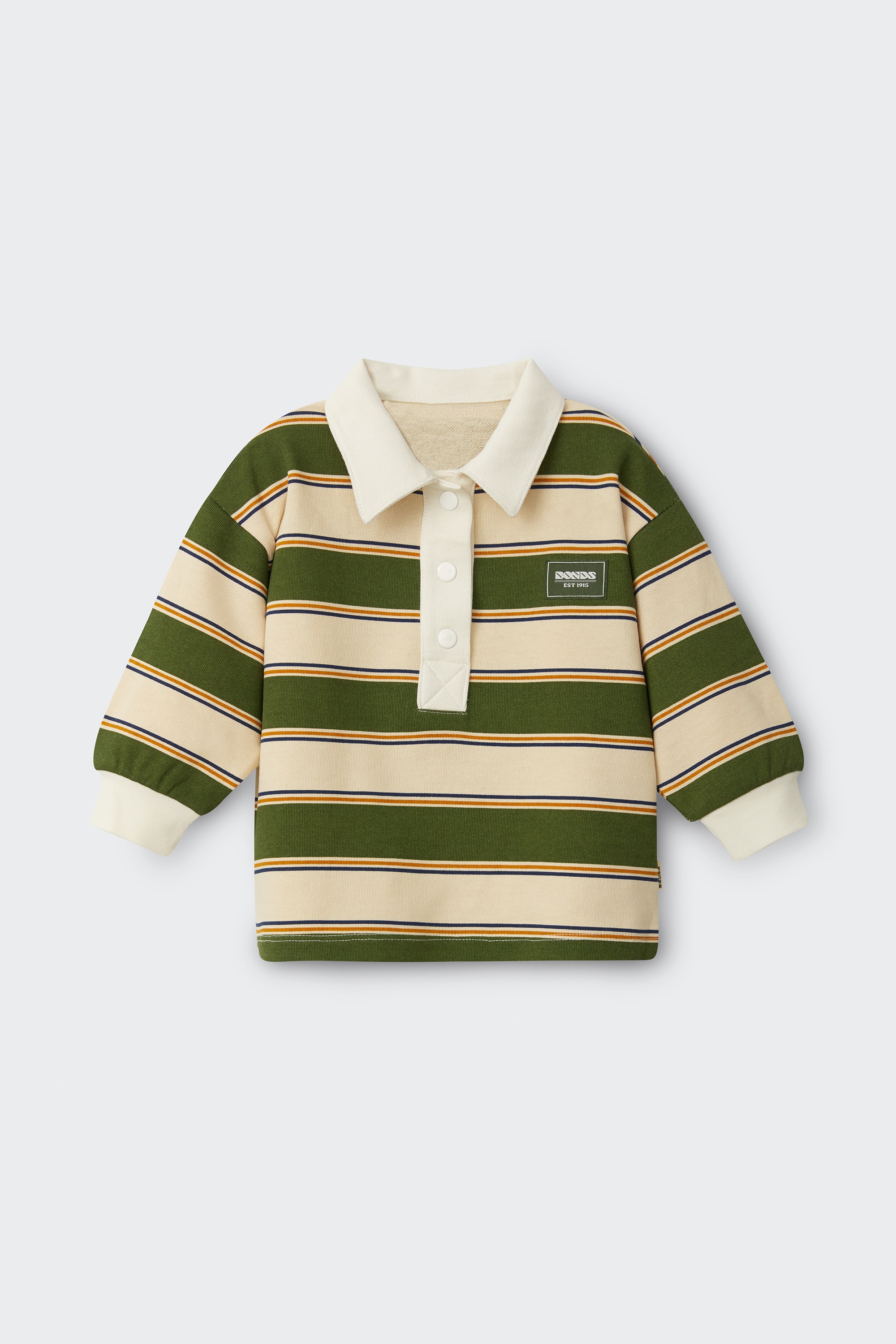 Big rugby energy in one tiny package. The Rugby Onesie serves up soft, sporty style with ribbed cuffs, a cute self fabric collar and the classic BONDS badge. With full-length sleeves and legs for extra cosiness, it's made for wriggling, rolling and those all-important cuddle tackles.