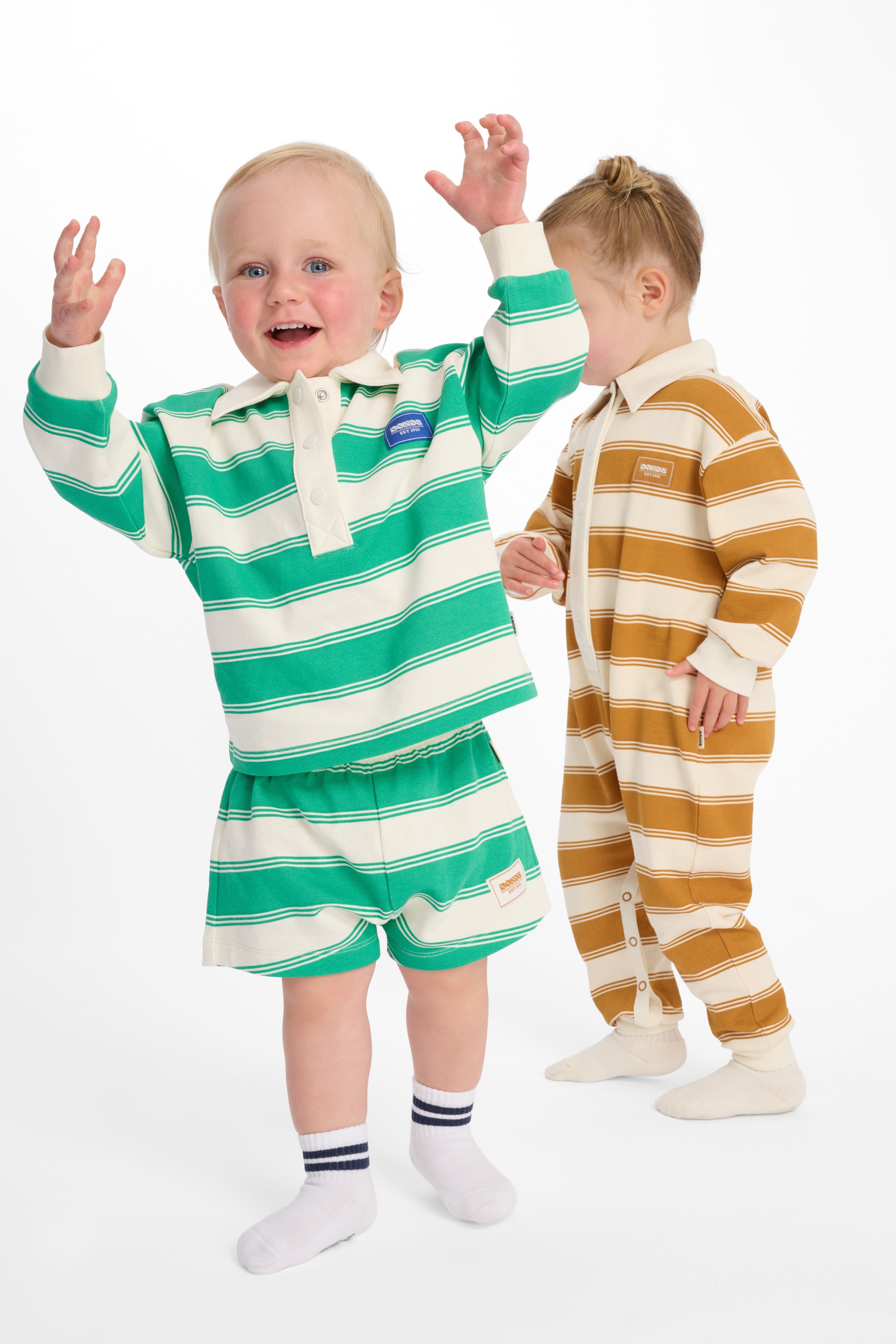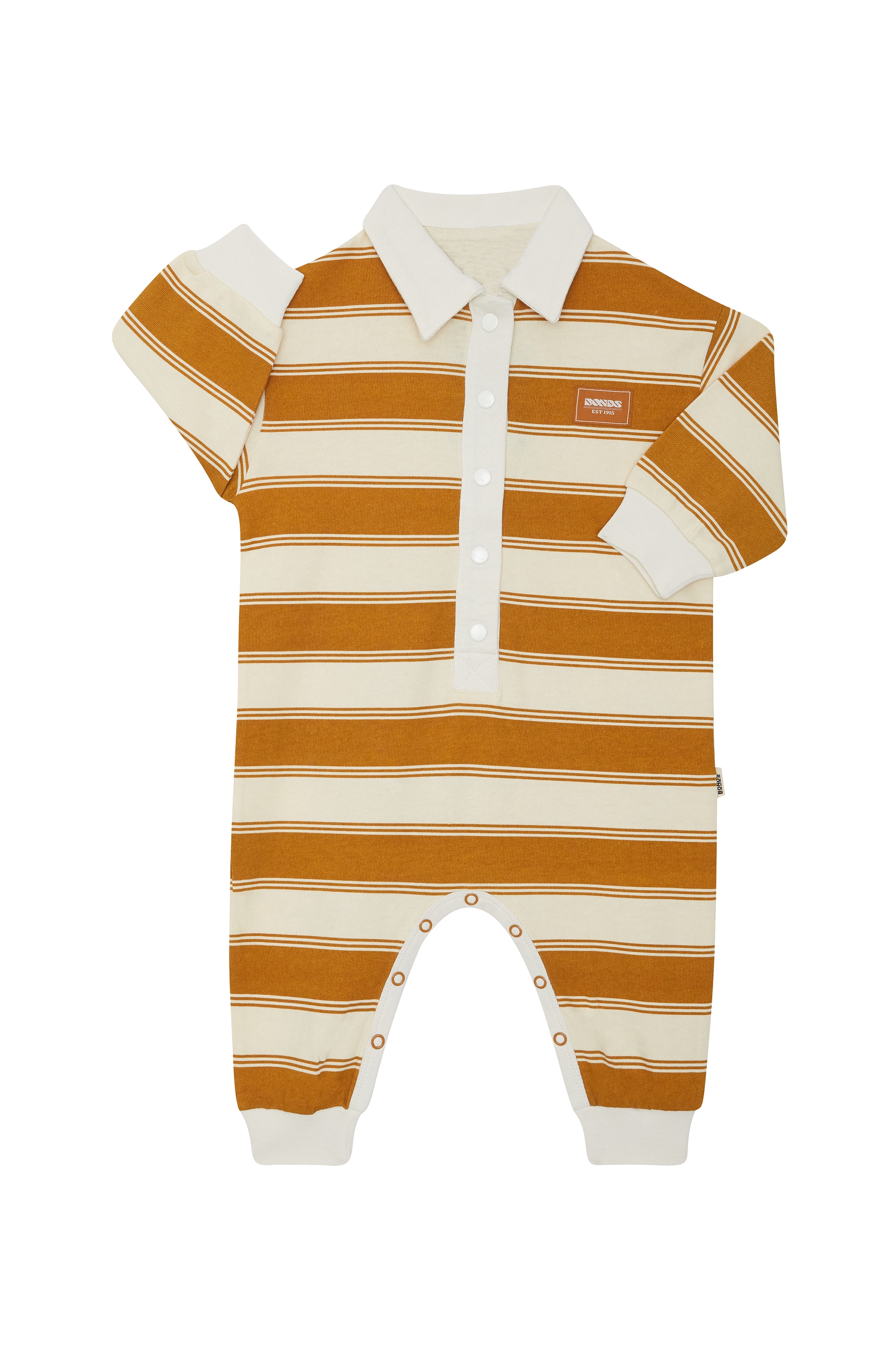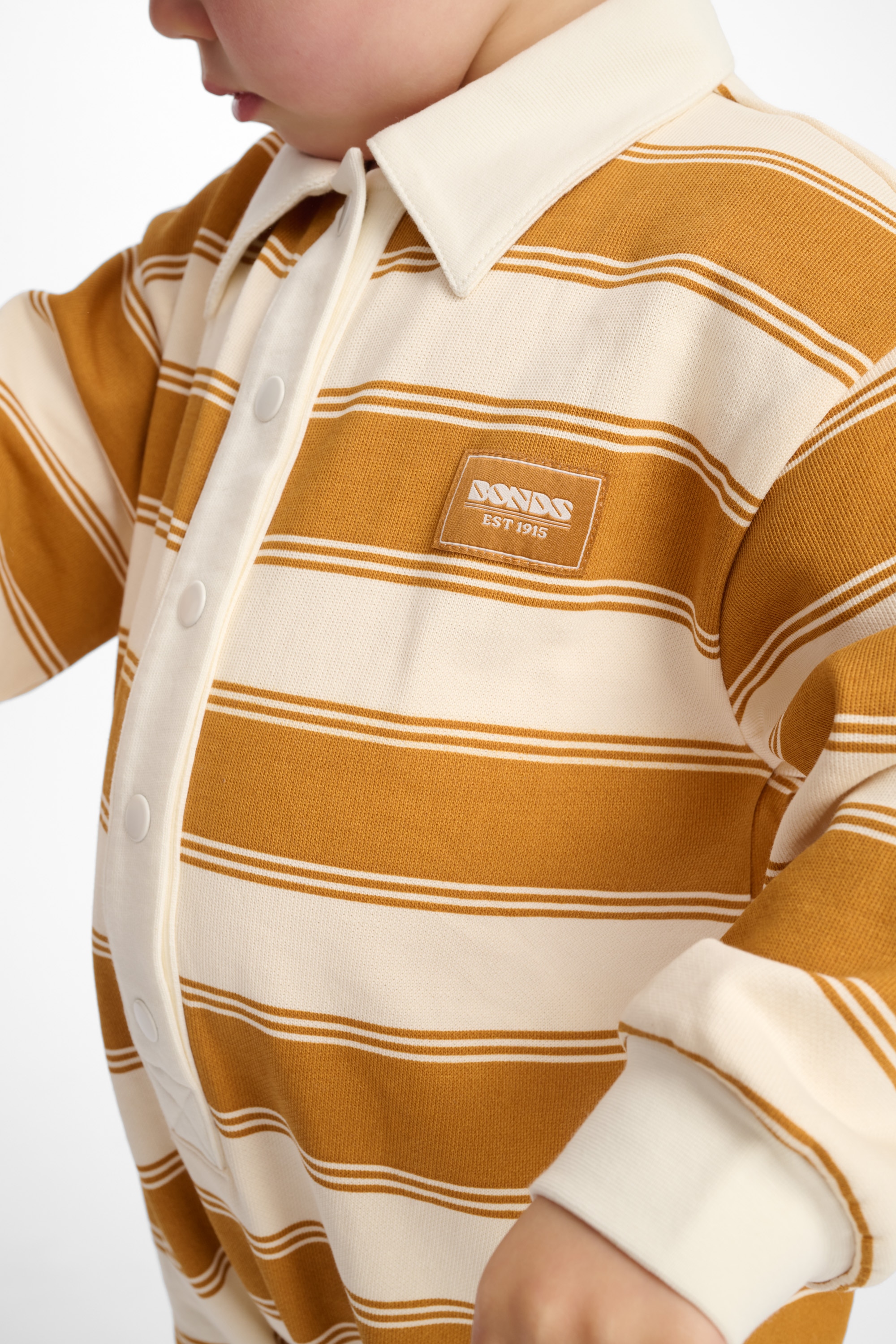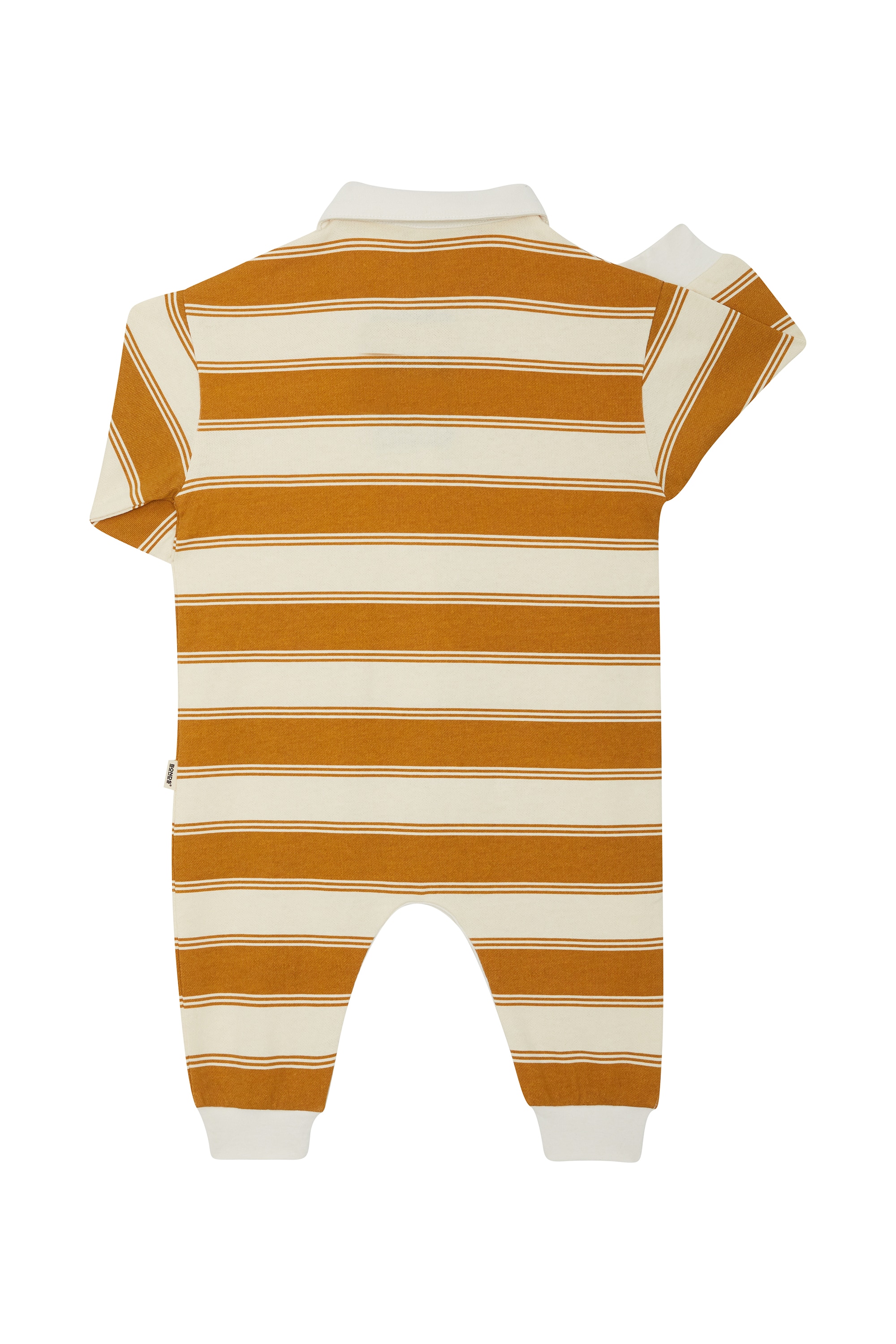 Big rugby energy in one tiny package. The Rugby Onesie serves up soft, sporty style with ribbed cuffs, a cute self fabric collar and the classic BONDS badge. With full-length sleeves and legs for extra cosiness, it's made for wriggling, rolling and those all-important cuddle tackles.