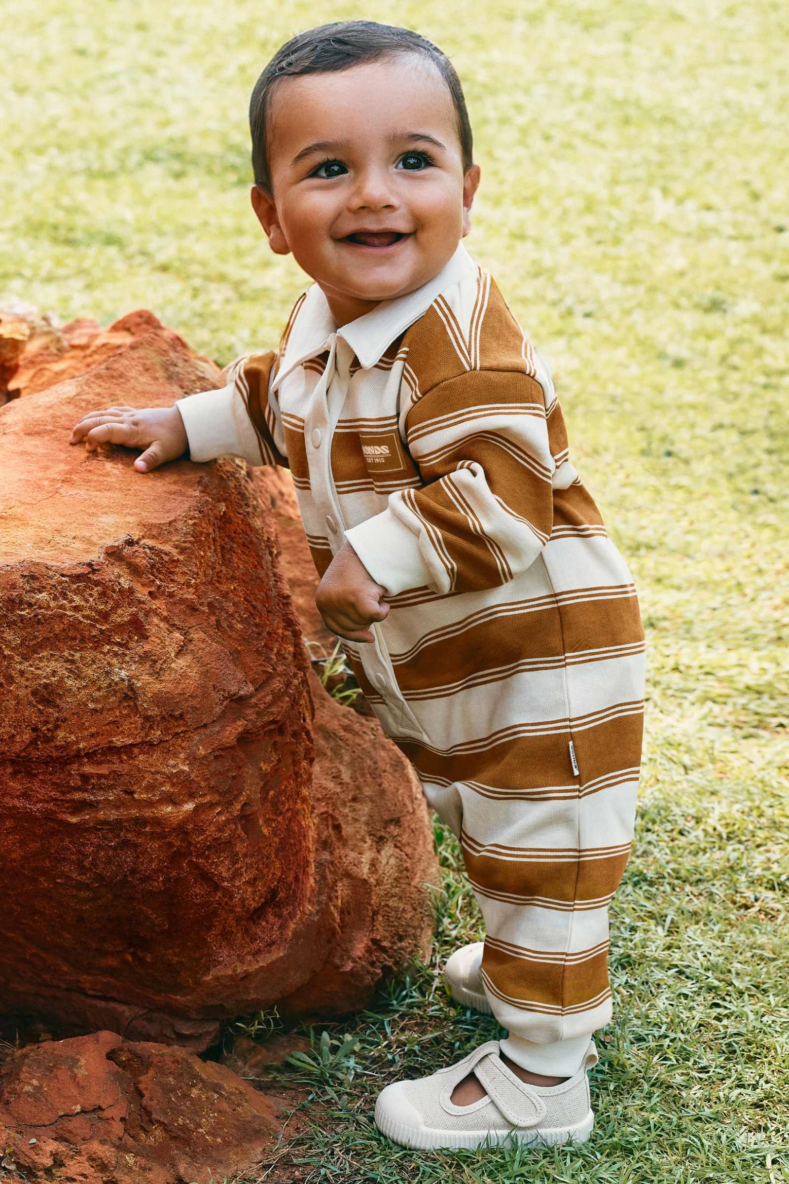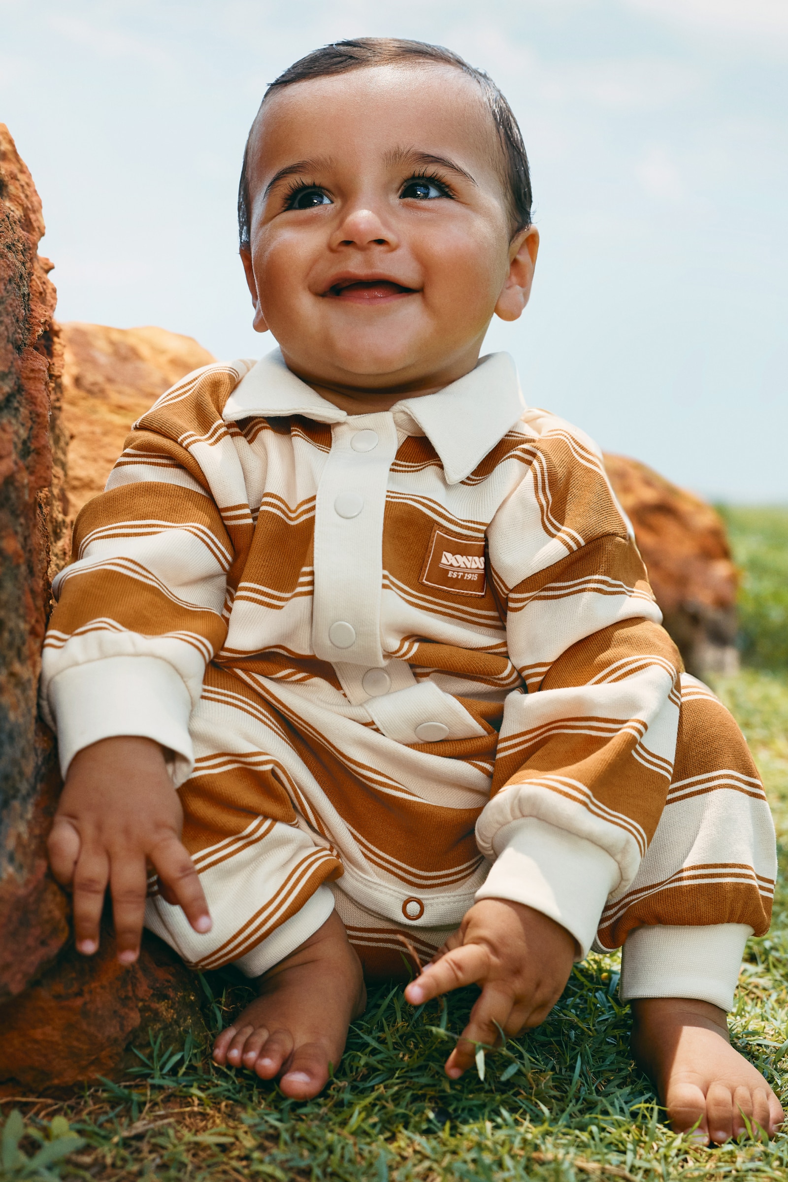 - • Baby coverall in a trendy rugby top style.